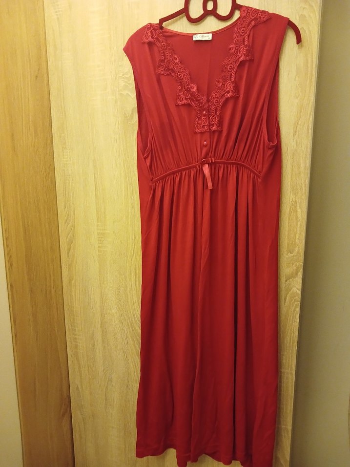 Parlak kırmızı renkte, kolsuz, V yakalı ve bol kesim uzun hamile ve emzirme geceliği.