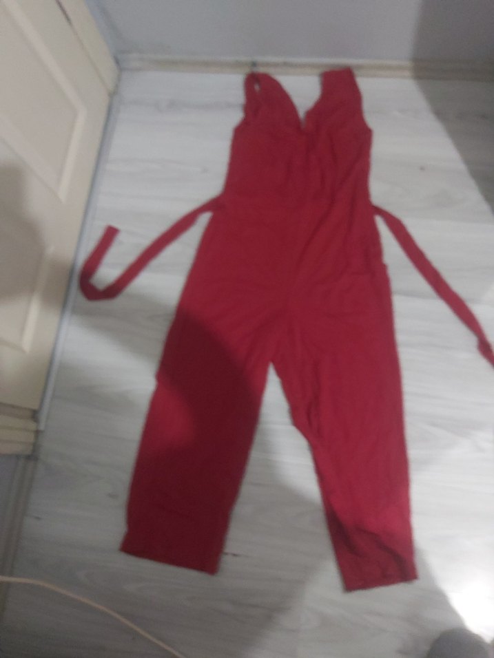 V yaka ve ince askılı, kırmızı renkli, yumuşak ve sıcak kumaştan yapılmış, midi uzunlukta, dar kesim kadın tulum. Sokak stiline uygun, zahmetsiz şıklık sunar.