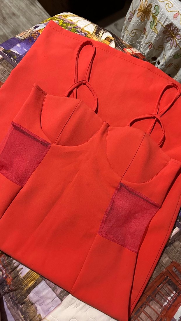 kırmızı sentetik kumaştan yapılmış, V yakalı ve ince askılı, vücuda oturan midi kalem elbise. Romantik buluşmalar için cesur ve şık bir tercih. ❤️