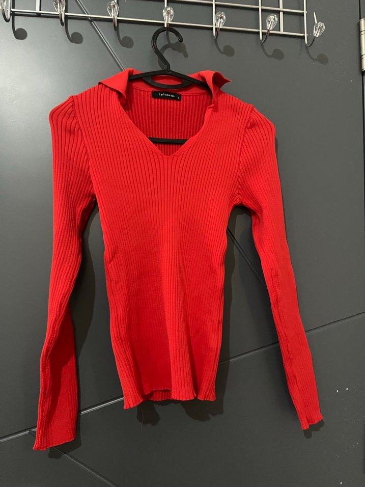 Kırmızı, V yakalı, ince triko örme, uzun kollu ve normal boyda kadın kazak. Günlük giyime uygun, spor tarzda rahat bir parça.