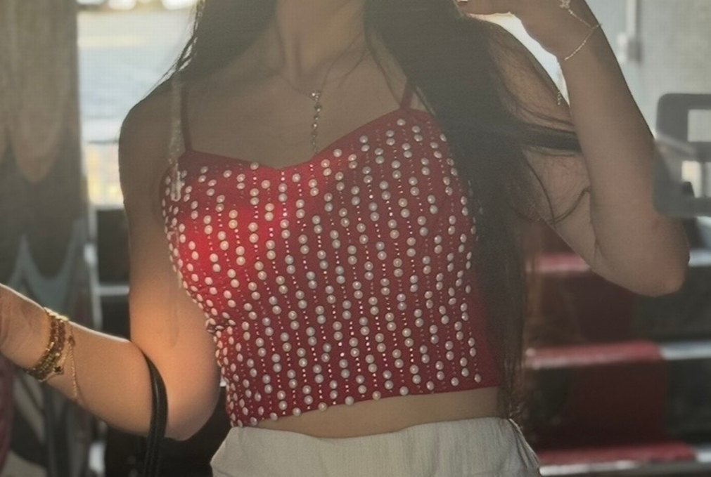 Kırmızı, V yakalı ve ip askılı, boncuklu ve nakışlı detaylara sahip dar kesim büstiyer. Sentetik kumaştan, romantik geceler için ışıltılı bohem tarzı. ✨