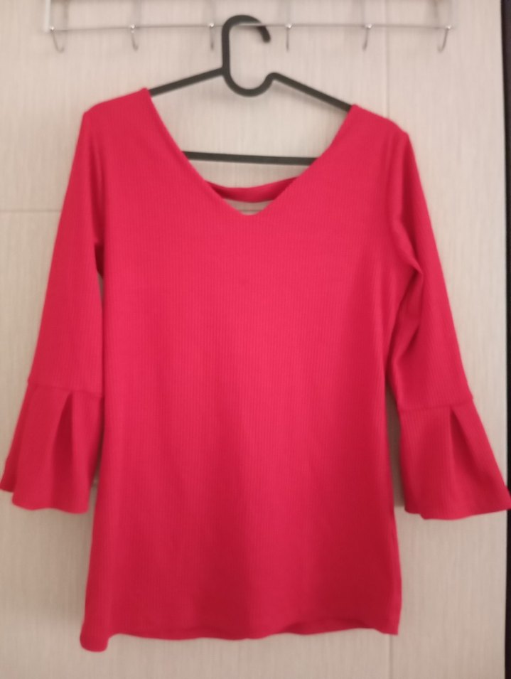 Kırmızı kadın bluz, V yaka ve pileli uzun kollara sahiptir. Sentetik kumaştan üretilmiş, bol kesim ve normal midi uzunluktadır. Sokak stiline uygun.Rengi kırmızıdır fotoğraftaki gibi fuşya degildir