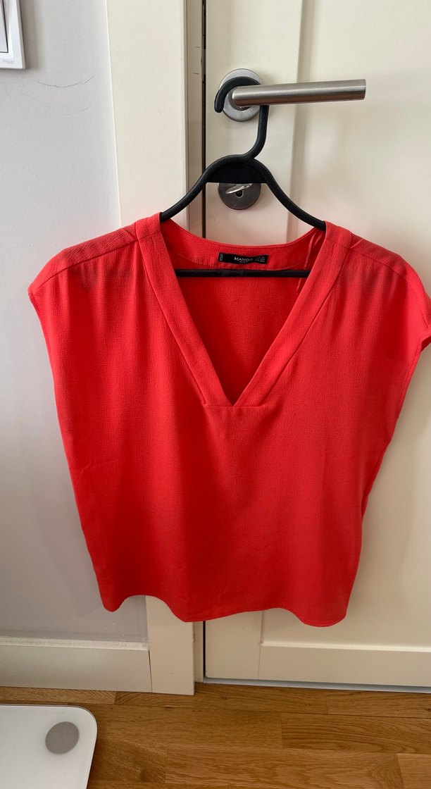 Kolsuz, kırmızı parlak renkte, V yakalı ve bol kesim kadın bluz. İpek gibi kumaştan üretilmiş, gündelik şıklık sağlar.