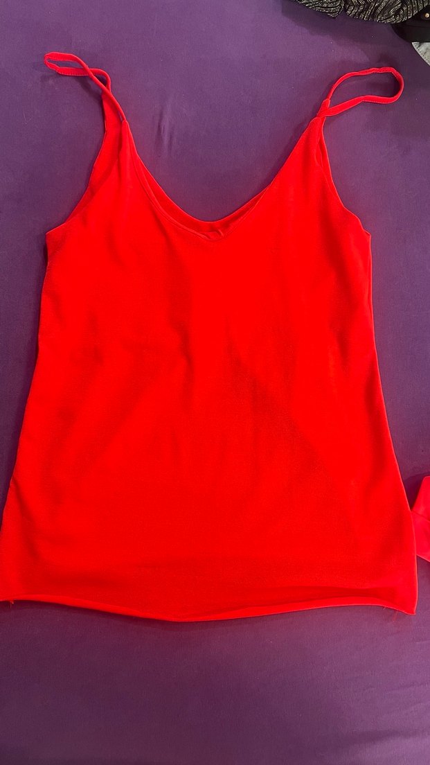 Kırmızı, V yakalı, kolsuz, vücuda oturan kadın atlet.tarzı bulüz Sentetik kumaştan, normal midi boyunda, spor ve athleisure tarzına uygun, cesur ve renkli bir görünüm sunar.