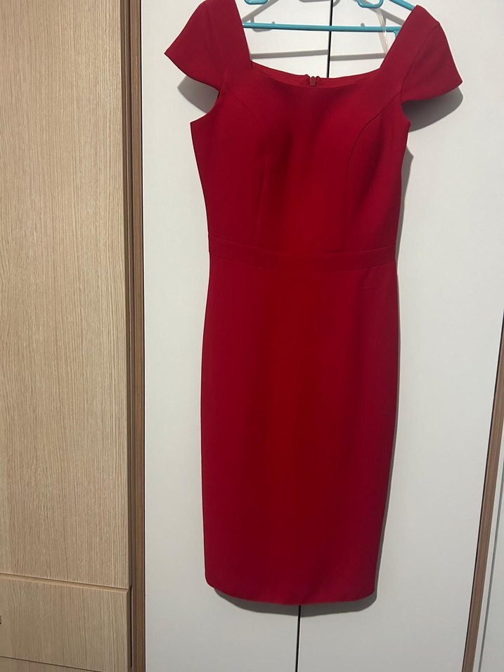 V yaka, kolsuz ve drapeli kırmızı midi elbise. Chima markasına aittir. 1.65 boy 60 kilo