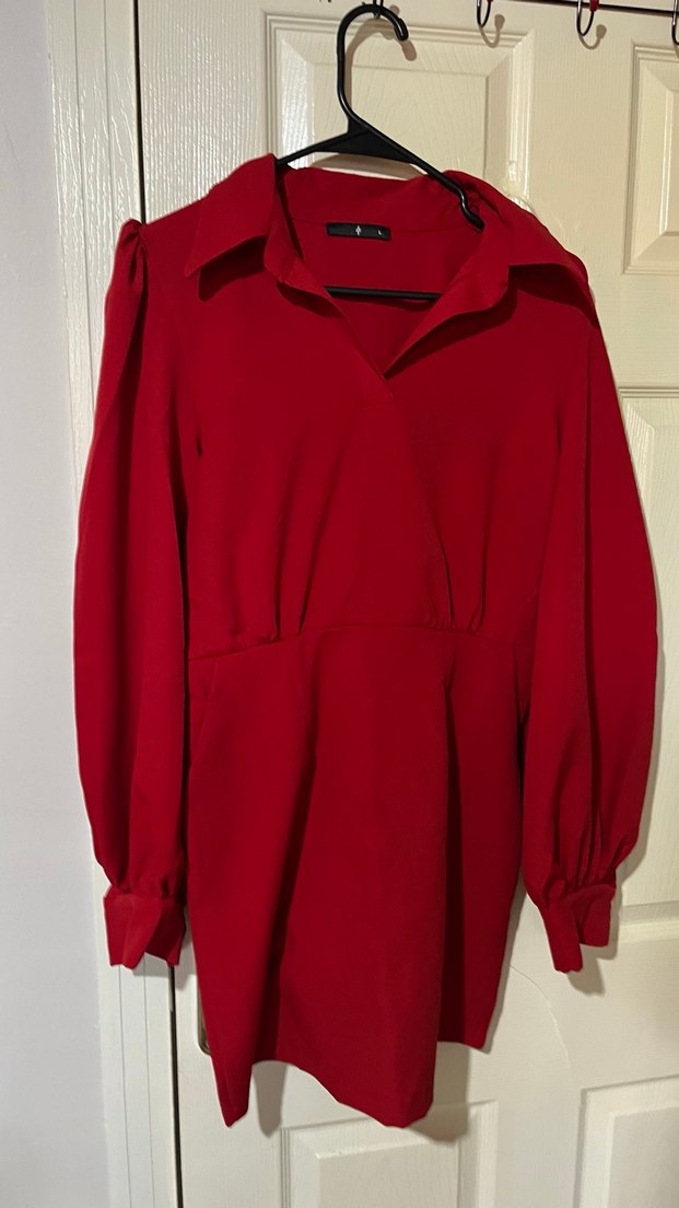 Uzun kollu, V yakalı ve drapeli kırmızı midi elbise. Kadınlar için uyumlu kesim, sentetik kumaştan, sokak stili ve romantik akşamlar için uygun. ❤️ bir kere giyildi Eyyo marka