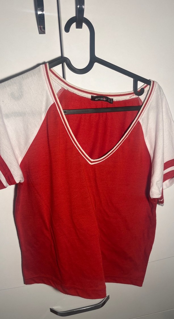 Kırmızı V yakalı, kısa kollu ve pamuklu rahat kesim kadın tişörtü. Parlak kırmızı rengiyle gündelik ve sokak tarzına uyum sağlar.