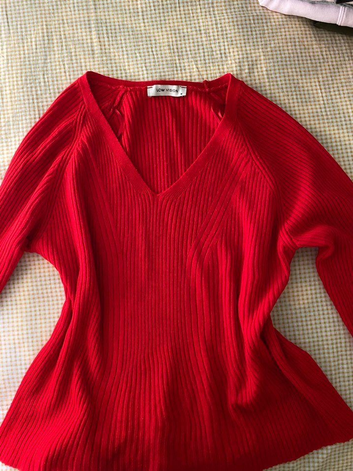Kırmızı renkli, V yakalı ve uzun kollu, rahat kesim triko kazak. Yumuşak örgü kumaştan, günlük kullanım için uygundur.