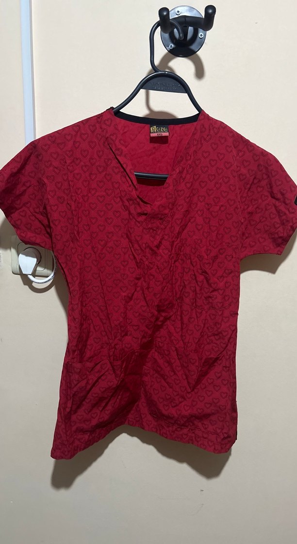 V yakalı ve kısa kollu, bol kesim kırmızı medikal önlük. Kalpli desenli önden cepli