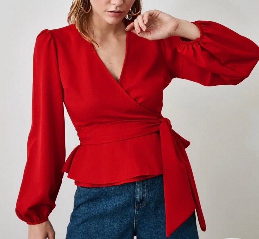 Kırmızı V Yaka Kemerli Kadın Bluz