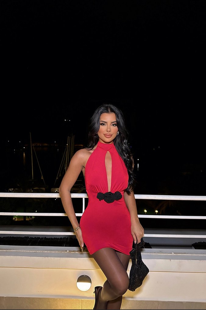 Kırmızı, kemerli, V yakalı, ince askılı, mini boy, baskılı gotik tarzda, saten dokulu dar kesim elbise. Romantik akşamlar için uygundur.