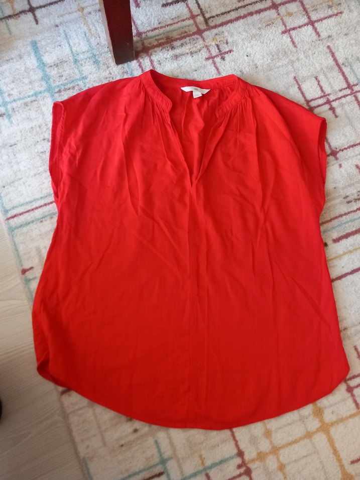 Kırmızı renkte, kısa kollu ve V yaka kadın bluz. Yumuşak keten kumaştan, bol kesim ve drapeli tasarıma sahip. Günlük kullanıma uygun, parlak dokunuşlu bohem tarzda.
