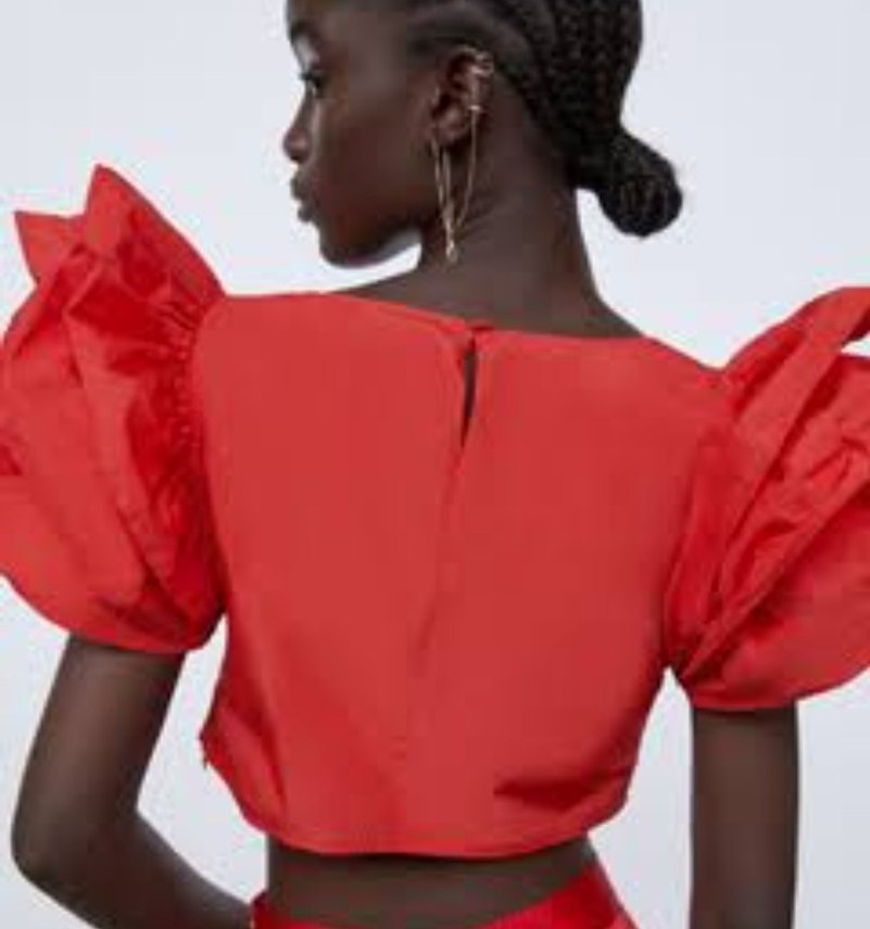 Sentetik kumaştan yapılmış, V yakalı, kısa ve fırfırlı balon kollu kırmızı dar kesim bluz. Kısa boyu ile sokak modası ve parti için uygun.