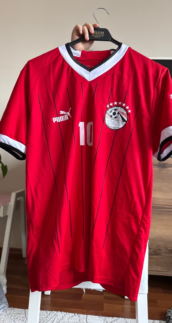 Parlak kırmızı sentetik kumaştan yapılmış, kısa kollu, V yakalı, baskılı ve düğmeli detaylara sahip erkek forması. Spor ve gündelik kullanım için uygundur. ⚽