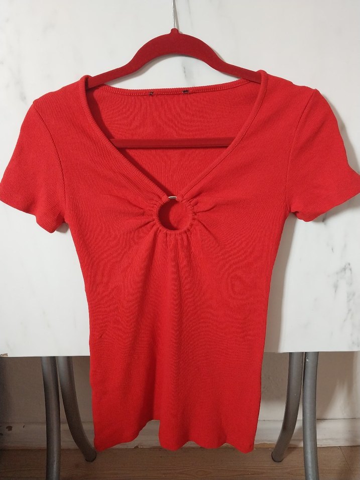 Nefes alabilen keten kumaştan yapılmış kırmızı, v yaka ve kısa kollu, vücuda oturan hamile tişörtü. Parlak yüzey ve yaka kısmında halka detayı bulunur, cesur ve minimalist sokak stili için uygundur.