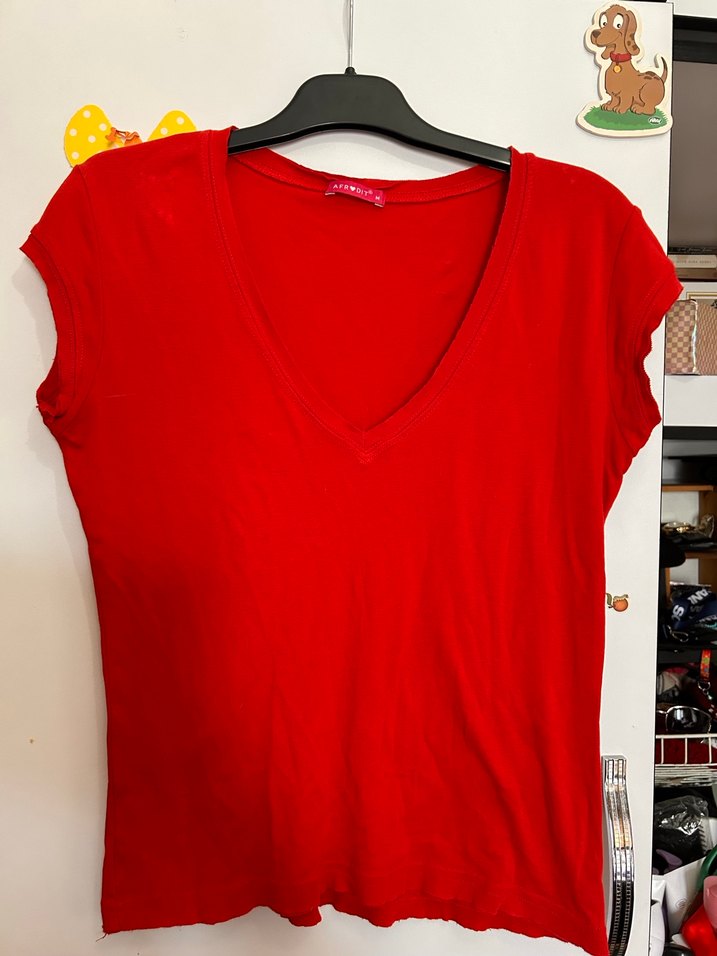 Kırmızı V Yaka Kısa Kollu Kadın Tişört
