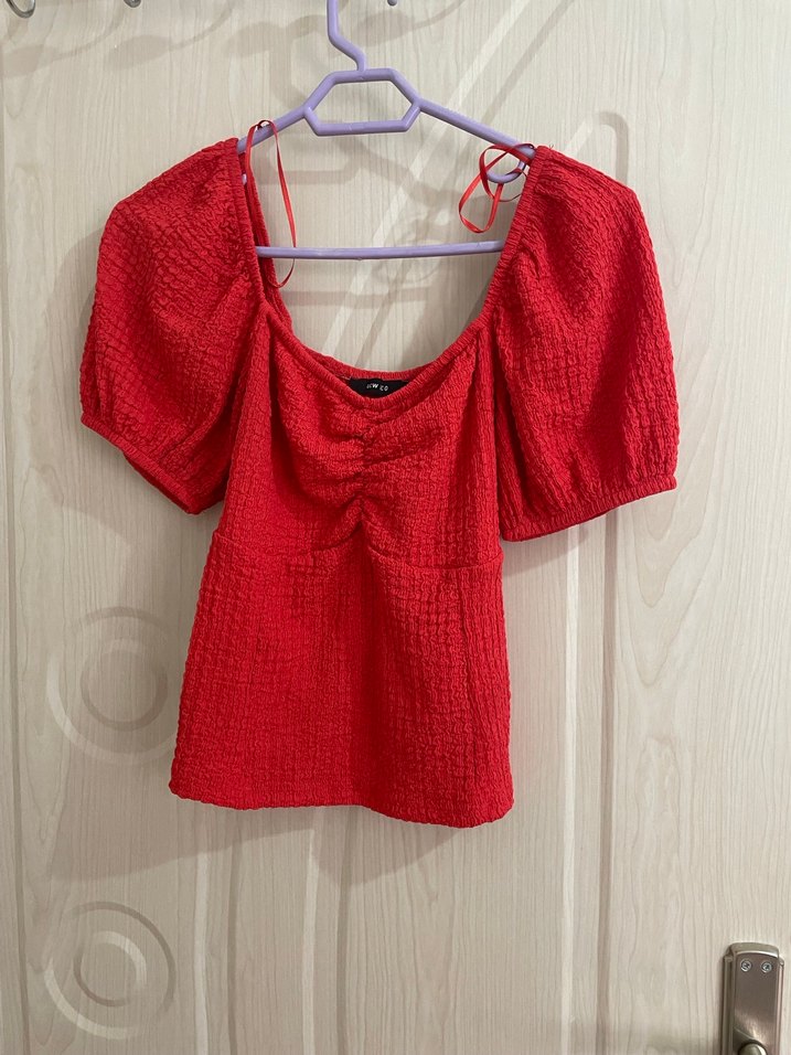 Kırmızı, kısa kollu ve V yakalı bu fitted bluz, örgü dokusu ve yumuşak keten kumaşıyla dikkat çeker. Kısa boyu günlük sokak tarzına uygundur.