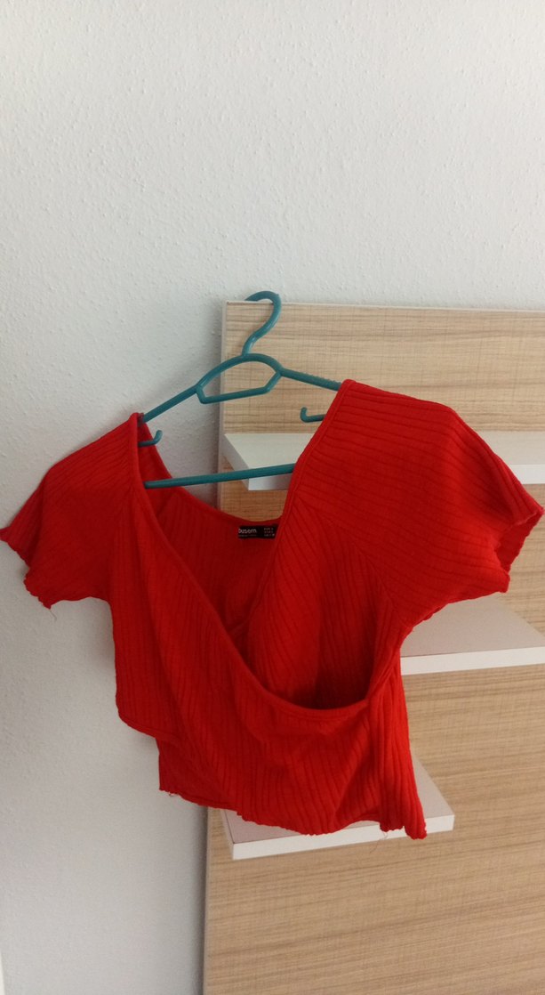 Kırmızı, parlak ve yumuşak keten kumaştan yapılmış, V yakalı, drapeli ve kısa kollu, vücuda oturan hamile bluzudur.