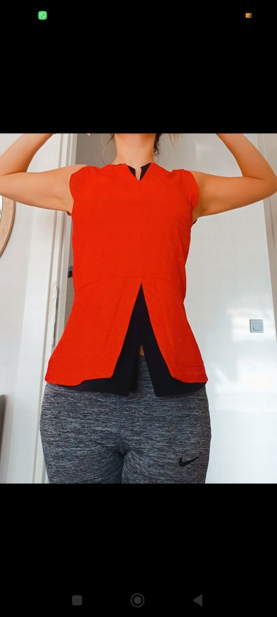 V yakalı, kolsuz ve önden yırtmaçlı, vücuda oturan kırmızı bluz.