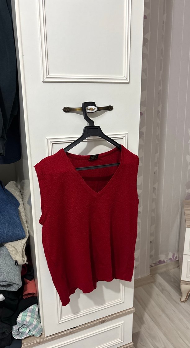Koyu kırmızı kolsuz kadın kazağı, V yaka ve bol kesimlidir. Örgü yün kumaştan yapılmış, midi boy ve desensiz, günlük rahat sokak stiline uygundur.