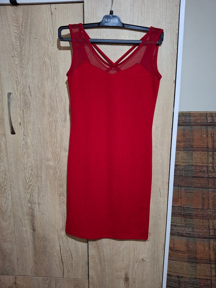 Kolsuz, V yaka ve drapeli detaylara sahip kırmızı, vücuda oturan midi elbise. Cesur ve minimalist çağdaş tarz sunar. Günlük kullanıma uygundur.