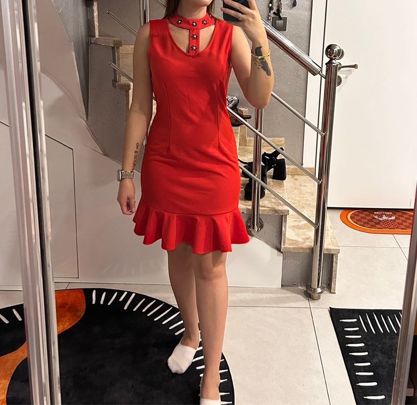 Sentetik kumaştan üretilmiş, V yakalı ve volanlı etek ucu detaylı kırmızı kısa elbise. Kolsuz tasarımıyla sokak modası ve iş stiline uygun, günlük kullanım için ideal.