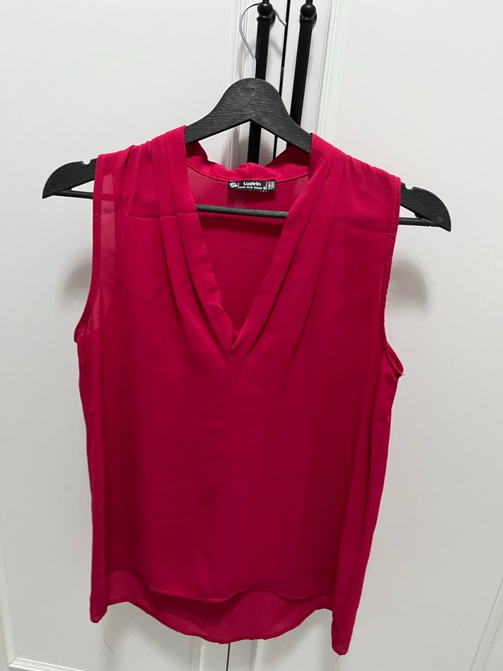 Kadınlar için parlak kırmızı renkte, V yakalı ve kolsuz tasarıma sahip bluz. Salaş kesim ve drapeli stil, ipeksi kumaştan, ofis için uygun. ✨