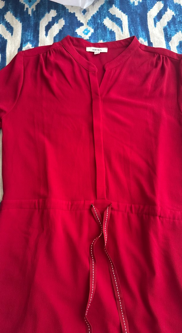 Parlak kırmızı renkte, V yakalı ve kuşaklı tunik. Rahat kesim fiyatta yardımcı olurum 89-90 cm boyu tesettür tunik