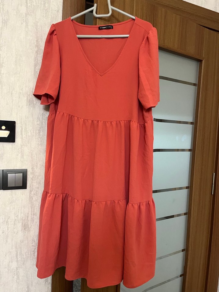 Yumuşak keten kumaştan, V yakalı ve kısa kollu, bol kesim midi elbise. Fırfır detaylı ve parlak kırmızı renkte, günlük kullanım için uygun.
