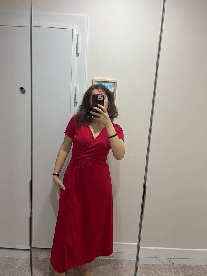 Ön tarafı gördüğünüz gibi açık. Rüzfarda dikkat etmek gerekir ya da iğneyle tutturulabilir. Parlak kırmızı kumaştan, V yakalı ve kısa kollu, drapeli kesime sahip dar kesim midi elbise. Romantik akşamlar için uygundur.