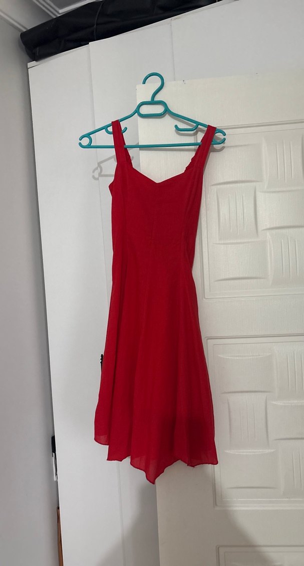 Kırmızı, v yaka, kolsuz ve drapeli kesimiyle bu midi elbise, şık ve fit durur.