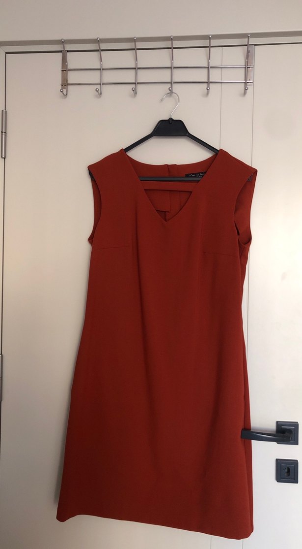 Kırmızı renkte, V yakalı ve kolsuz midi elbise. Drapeli detaylarla sade ve şık, ofis veya günlük kullanım için uygundur.