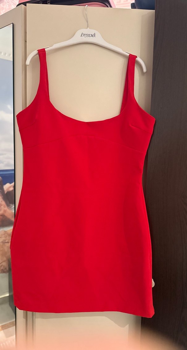 Kolsuz kırmızı midi elbise, v yaka ve vücuda oturan kesimiyle romantik akşamlar için şık ve iddialı bir görünüm sunar. Parlak kumaşı minimalist tarzı tamamlar. ❤️