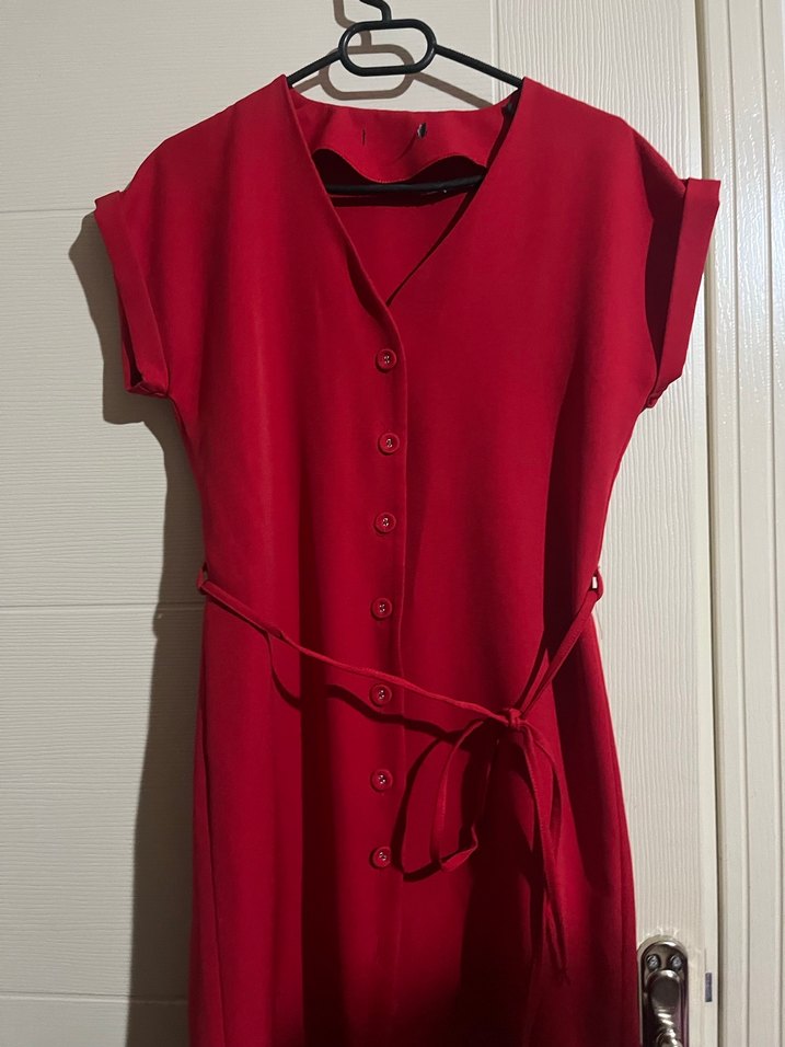 Kırmızı midi elbise, V yaka, kısa kollu ve düğmeli. Belden bağlamalı, bol kesim, yumuşak sentetik kumaştan, rahat ofis şıklığı için uygun.