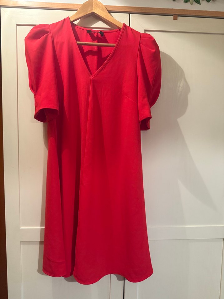Kırmızı midi elbise, V yaka ve drapeli kısa kollu, ipeksi kumaştan, bol kesimdir. Modern tarzıyla romantik akşamlar için uygundur. ❤️ karpuz kol