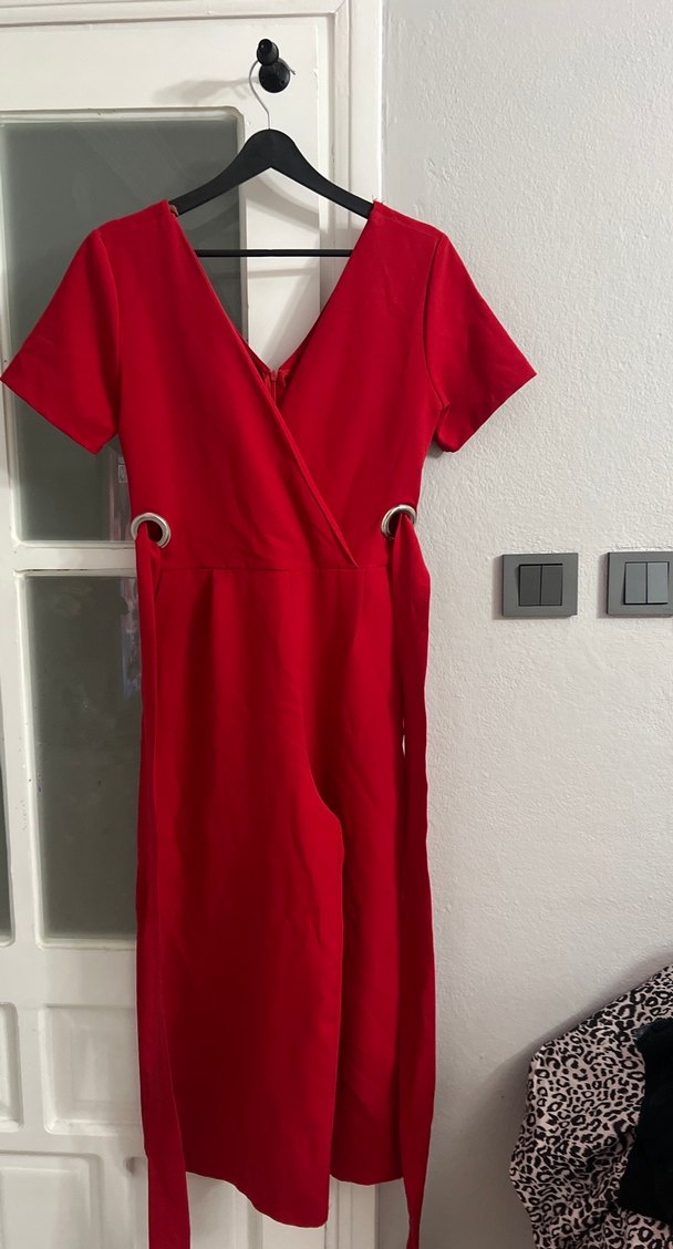 Kırmızı, V yakalı, kısa kollu midi tulum. Bel detaylı ve parlak sentetik kumaştan, minimal ve sokak modasına uygun.metal aksesuarlarında kararma daha yoktur harika zamansız bir tulum