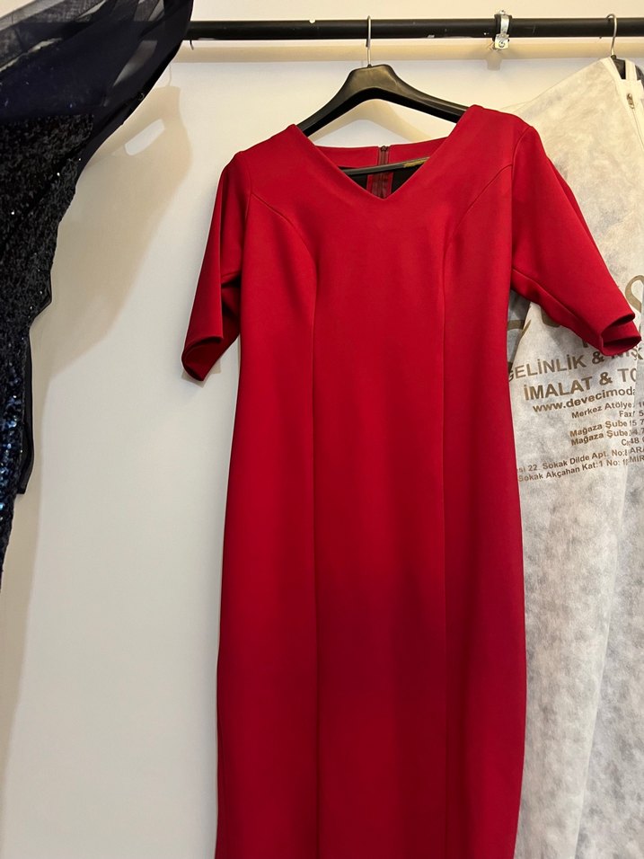 Kırmızı, V yakalı midi kalem elbise, kısa kollu ve sentetik dokulu kumaştan, drapeli detaylıdır. Modern klasik tarzda, ofis için uygundur. ✨