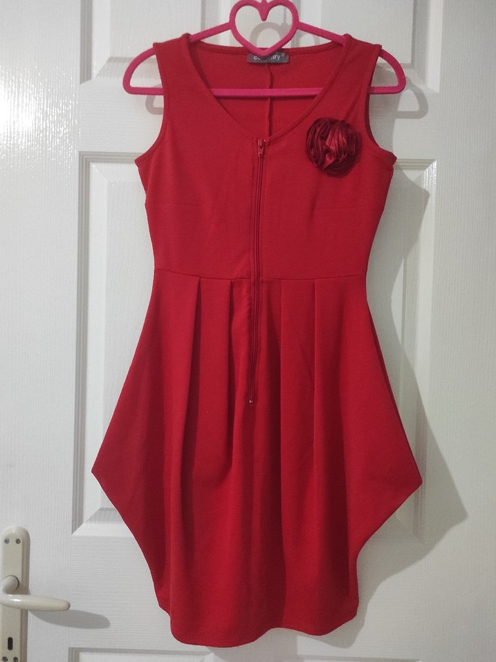 Kolsuz kırmızı midi elbise, V yaka ve pile detaylarına sahip. Günlük kullanıma uygun, renkli ve desensiz, modern kesimli bir modeldir.