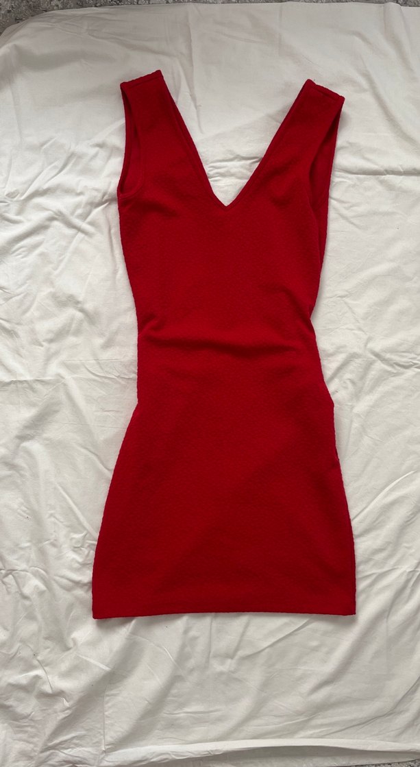 Kırmızı, v yaka ve kolsuz, belden oturan midi mini elbise.