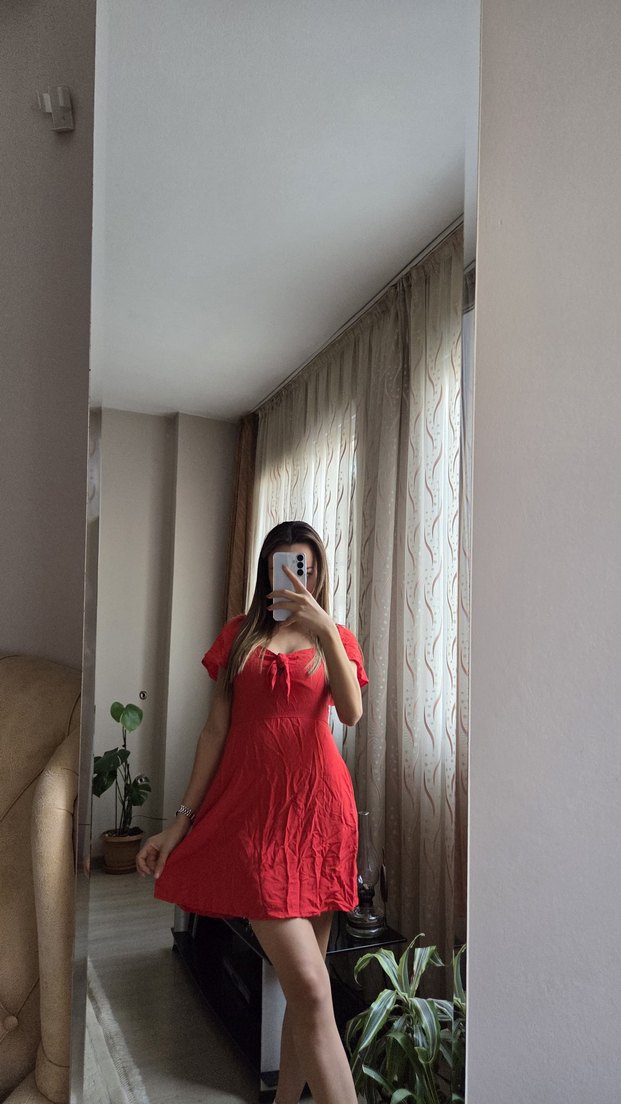 Kırmızı, V yakalı, ince askılı ve şeffaf detaylı, ipeksi kumaştan midi boy dar kesim elbise. Romantik buluşmalar için uygun. ✨
