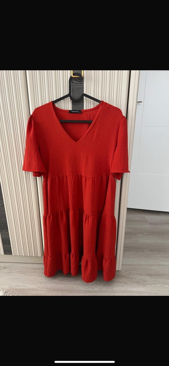 Koyu kırmızı renkte, V yaka ve kısa kollu midi elbise. Pamuklu yumuşak kumaştan, bol kesim ve pile detaylı, bohem tarzda günlük kullanım için uygundur.