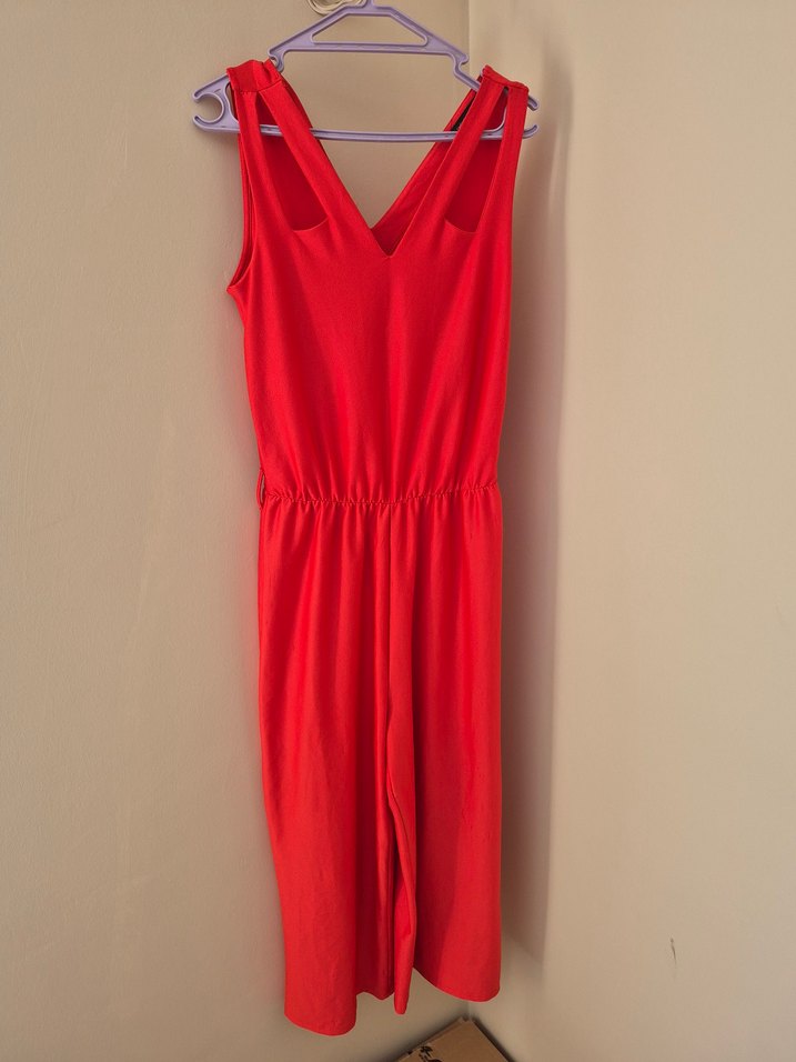 Kırmızı, kolsuz, V yakalı midi tulum, drapeli ve vücuda oturan kesimle, yumuşak sentetik kumaştan üretilmiştir. Sokak modasına uygun.