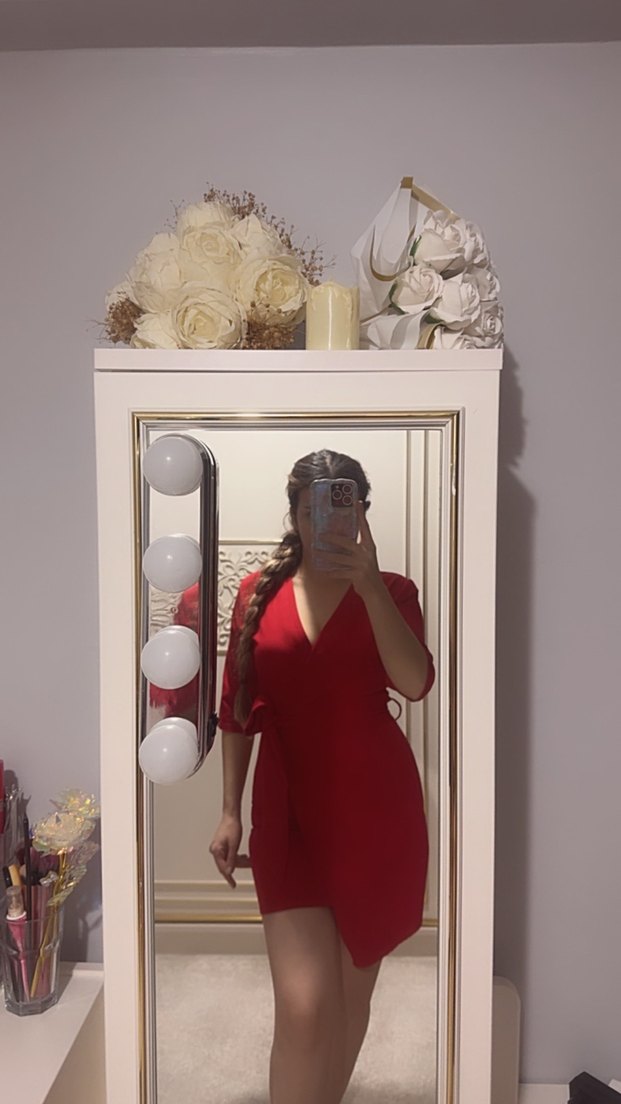V yaka ve ince askılı, kırmızı, parlak ve ipeksi kumaştan mini elbise. Şeffaf detaylı, romantik akşamlar için uygun. ❤️36 38 bedene uygundur gozuktugu gibi hiçbir deformemesi yoktur