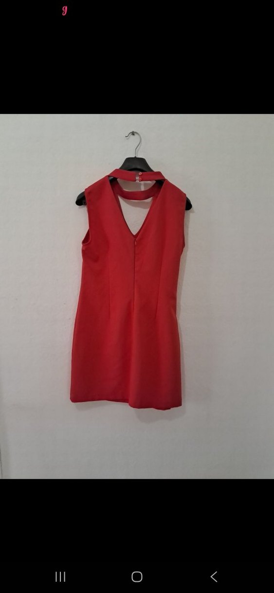 Kolsuz, V yakalı kırmızı mini elbise. Parlak sentetik kumaştan, dar kesim ve şık yırtmaç detayına sahip. Sokak modasına uygun.