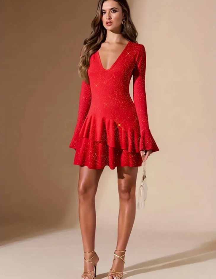 Bir kez giyildi. Parlak sentetik kumaştan, derin V yakalı ve uzun kollu, fırfırlı etek ucu ve manşet detaylı, işlemeli kırmızı mini elbise. Romantik buluşmalar için ideal.