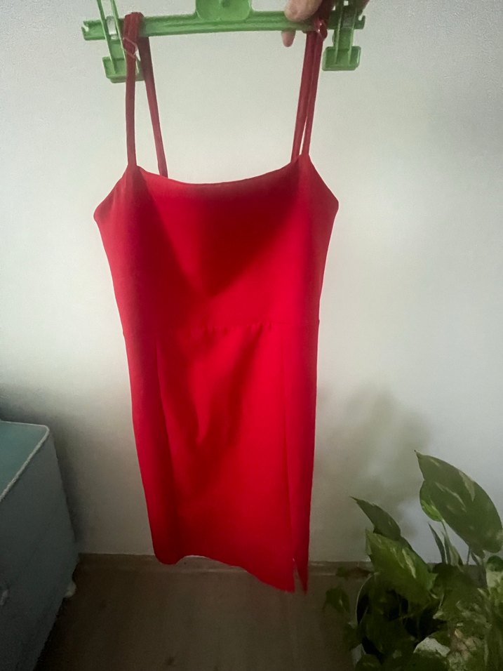 Kırmızı mini elbise, V yaka ve askılı kollara sahip. Pürüzsüz sentetik kumaştan yapılmış, yırtmaç detayıyla cesur ve minimalist tarz için uygun. ❤️