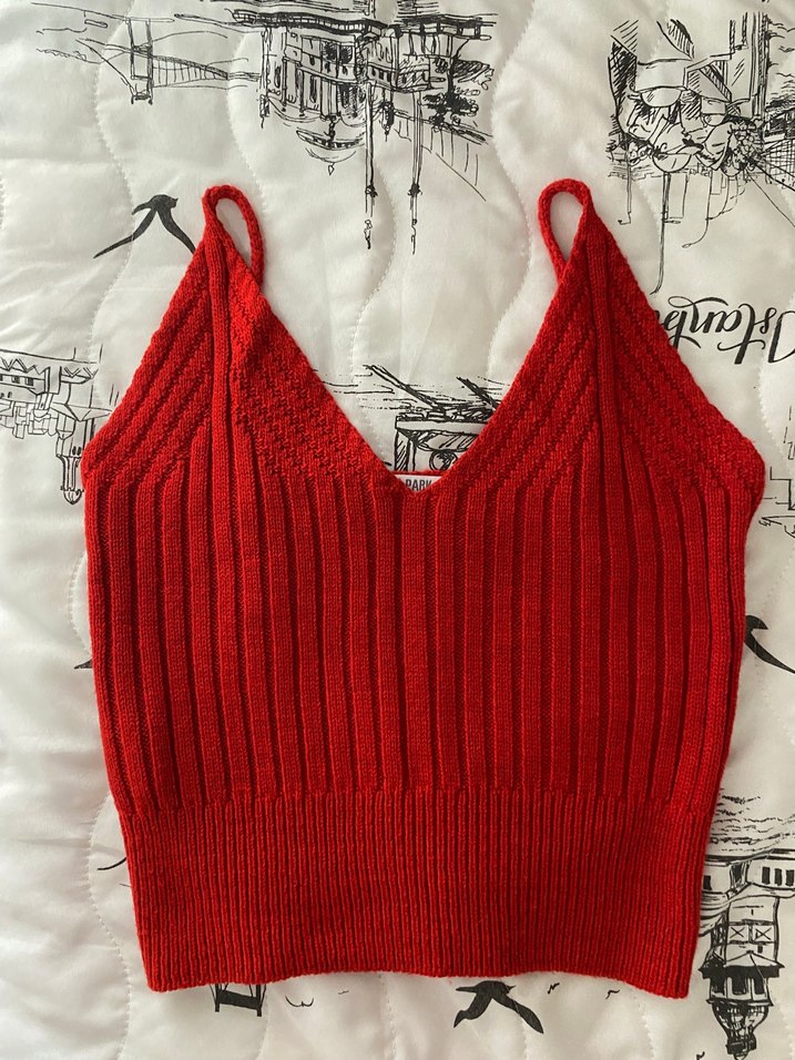 Kırmızı örgü crop top, V yaka ve kolsuz yapısıyla rahat ve şık bir görünüm sunar. Kısa boyu ve bohem tarzıyla günlük kullanıma uygundur.