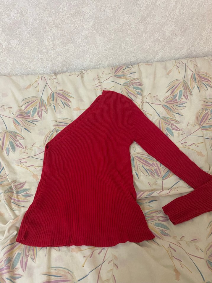 Uzun kollu, V yaka ve kırmızı renkte, yumuşak örgü kumaştan yapılmış, bohem tarzda fit kesim kadın kazak. Günlük kullanıma uygundur.