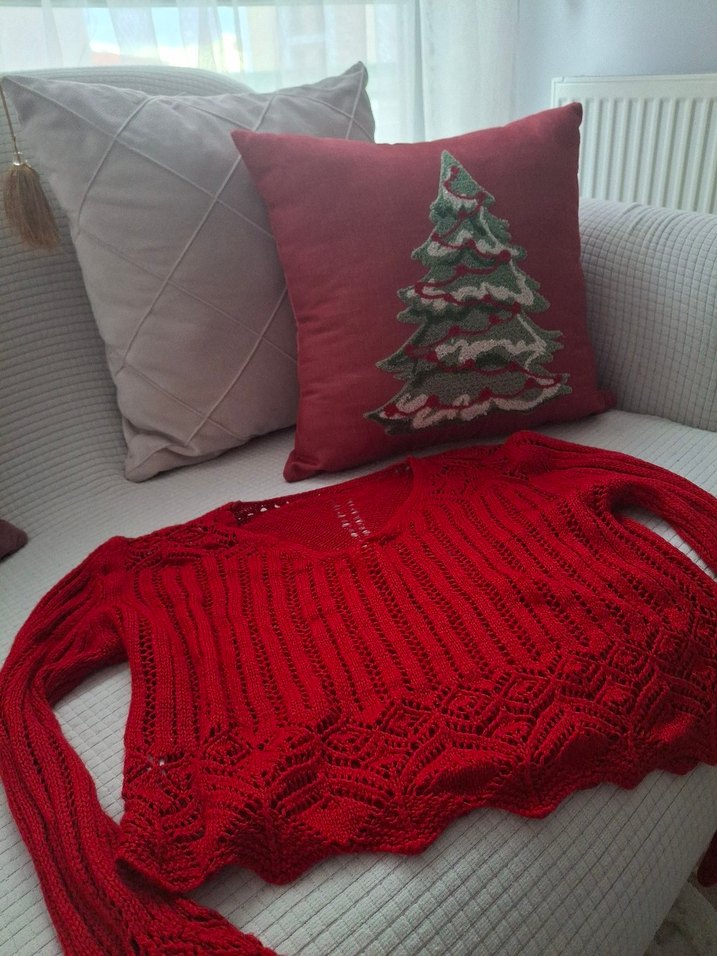 Parlak kırmızı renkli, V yakalı, uzun kollu, bol ve kısa kesim örgü kadın kazak. Bohem tarzına uygun.