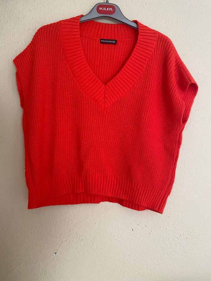 Kırmızı, V yaka, kolsuz ve gevşek kesim örgü kadın süveter. Kısa boyu ve desensiz yapısıyla rahat sokak stili için uygundur.